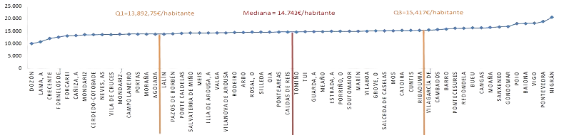 Cos datos dispostos desta maneira xa podemos empezar a dicir algunha cousa. A renda por habitante dos concellos de Pontevedra vai dende un mínimo de 10.068 €/hab. en Dozón a un máximo de 20.606 €/hab. en Nigrán. A diferenza entre o valor máximo e o mínimo coñécese como rango ou percorrido. Na provincia de Pontevedra, o rango das rendas por habitante dos concellos é: