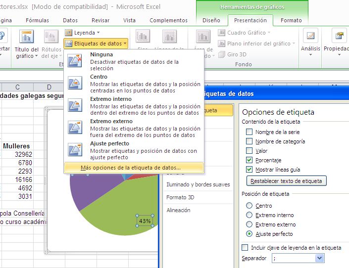 No gráfico que temos neste momento non aparecen os rótulos das procentaxes que corresponden a cada categoría, para incluílos, coa gráfica en edición, tes que seleccionar na pestana de "presentación" das "ferramentas de gráficos" as etiquetas de datos. No menú despregable seleccionamos "máis opcións de etiqueta de datos..." e na xanela emerxente marcamos "Porcentaxe" para que en cada categoría da variable se amose a porcentaxe que representa sobre o total.
