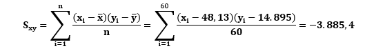 De aquí, podemos deducir que hai certa dependencia lineal (se non a houbese a covarianza sería 0), e que esta é negativa pois o signo da covarianza tamén o é. Pero xa non deducimos nada máis, non podemos saber se a relación é forte ou non.