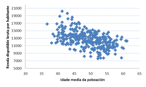 A recta de regresión da renda dispoñible bruta por habitante sobre a idade media da poboación pódese empregar para facer estimacións.