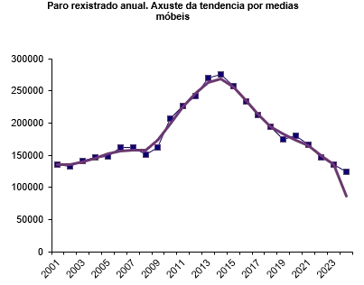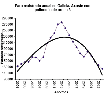 Se se examinan os dous axustes, que se poden ver nas figuras anteriores, apréciase que é moito mellor o polinomio de grao 3, que reflicte a tendencia con, aparentemente, menor erro. Á hora de estimar os parámetros dos modelos resulta moi conveniente eliminar previamente a compoñente estacional da serie (é dicir, desestacionalizar a serie). Isto pódese conseguir substituíndo a serie orixinal pola obtida ao facer a media, para cada instante t, todas as observacións do ciclo estacional que comeza en t. O método máis empregado para suavizar as variacións periódicas dunha serie temporal é o método das medias móbiles. Un dos casos máis habituais é o das series mensuais con estacionalidade anual (é dicir, p=12 meses). Para suavizar a serie do número de demandantes de emprego anual empregando o método das medias móbiles tomamos p=3. A serie resultante, que se amosa na seguinte figura, é máis suave que a serie orixinal.