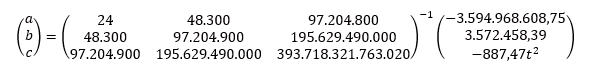 Entón, o axuste parabólico sería f(t)=-887,47t2+3.572.458,39-3.594.968.608,75. Examinando o axuste, que se pode ver na figura inferior, obsérvase que quizais se subimos o grao do polinomio o axuste sería mellor. Polo tanto, repetirase o proceso axustando un polinomio de grao 3.