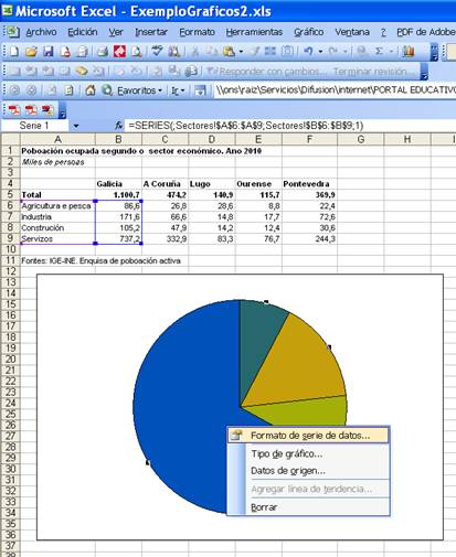 Prememos co botón esquerdo riba do gráfico de sectores para seleccionalo e a continuación pinchamos no botón dereito do rato. Sairanos un menú no que debemos elixir a opción "Formato de serie de datos ..."