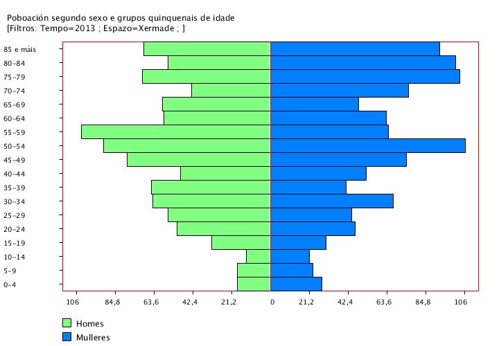 Na pirámide, cada barra representa a poboación dun grupo de idade e xénero sobre o total. Está expresada en tanto por un, non en tanto por cen!